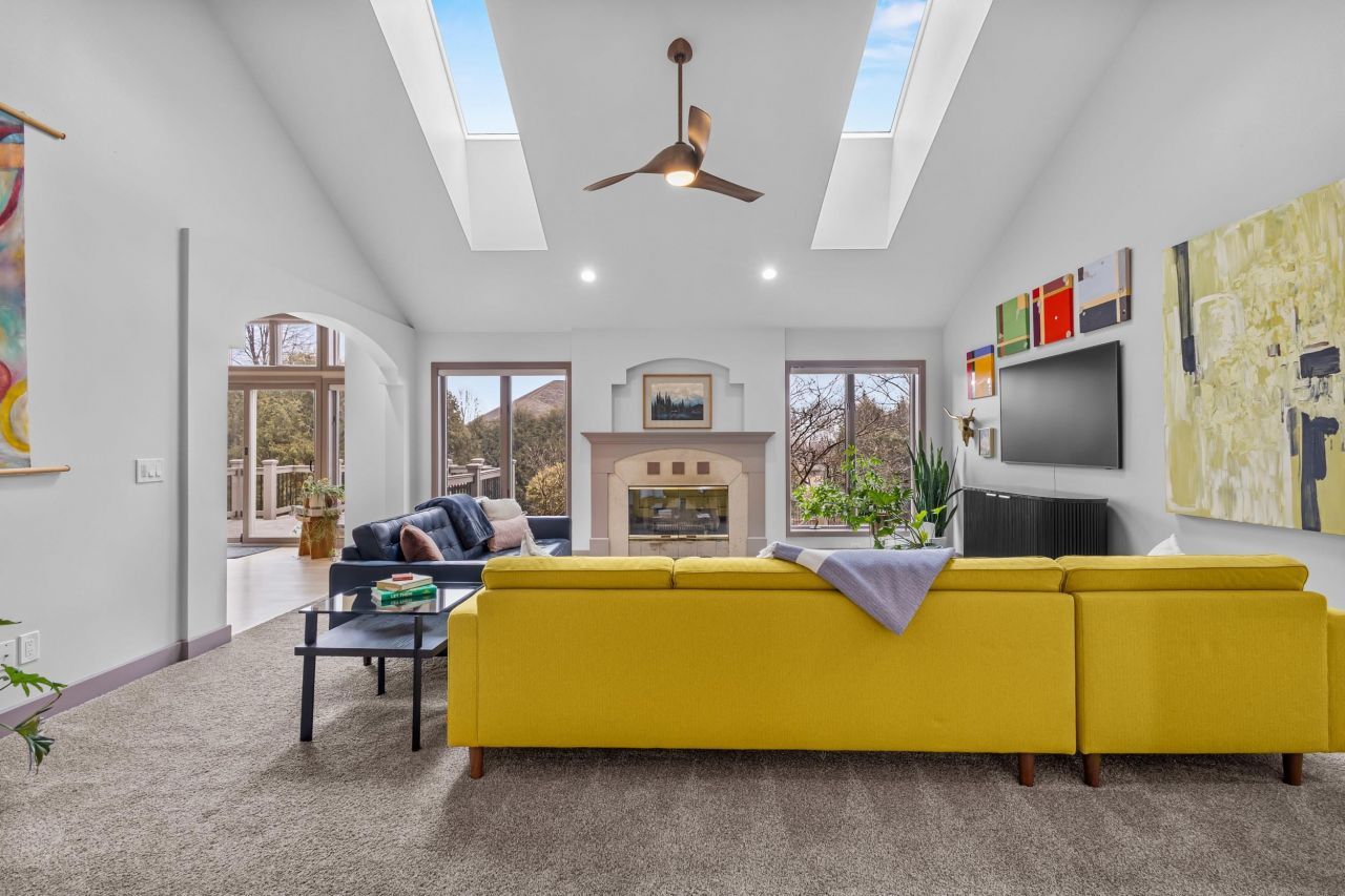 Designed by architect E. Edward Linville as a 1989 Parade Home, this custom Craftsman/Prairie residence blends architectural pedigree with warm craftsmanship. A striking stone exterior and new color palette lead to an 8-ft entry door opening to soaring ceilings, walls of windows, a grand library, and a light-filled living room with custom skylights and a gas fireplace. Rich woodwork appears throughout, including rare Bird's Eye Maple cabinetry in the kitchen. The main level features a spacious primary suite with jetted tub and walk-in shower, plus an office that could also be used as formal dining, a mudroom, laundry, and 4-car garage. Upstairs offers three bedrooms and bath, while the exposed lower level adds a 5th bedroom, expansive rec. spaces, full bath, and sauna. Set on a beautifully positioned .6-acre lot backing to green space and trails. Recent updates include furnace, A/C, sliding doors, front door, and exterior paint.