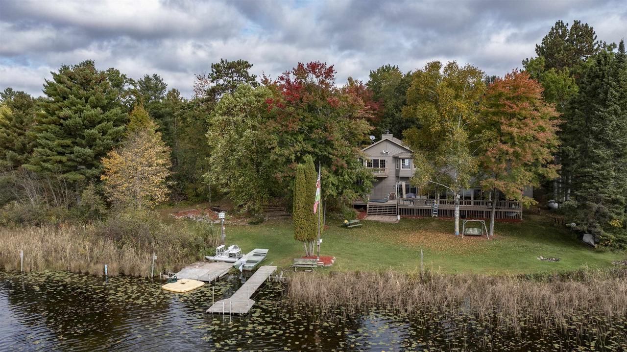 Tucked at the end of a quiet cul de sac, this inviting Graham Lake home offers frontage and a dock on the Lake & peaceful Leer Creek, set on more than seven private acres with walking trails to explore. The spacious primary suite features its own deck, cozy sitting area, and stunning water views from every window. A formal living room with cozy fireplace is perfect for gathering, while the bright kitchen with two islands & open concept dining area makes entertaining easy. Enjoy the expansive deck, relax in the hot tub, and take in the natural surroundings. Laundry on both levels, an indoor sauna & a charming outdoor bath house add comfort and convenience to this serene waterfront retreat. Plenty of space to roam, host guests, and truly unwind in every season. A true hidden gem!